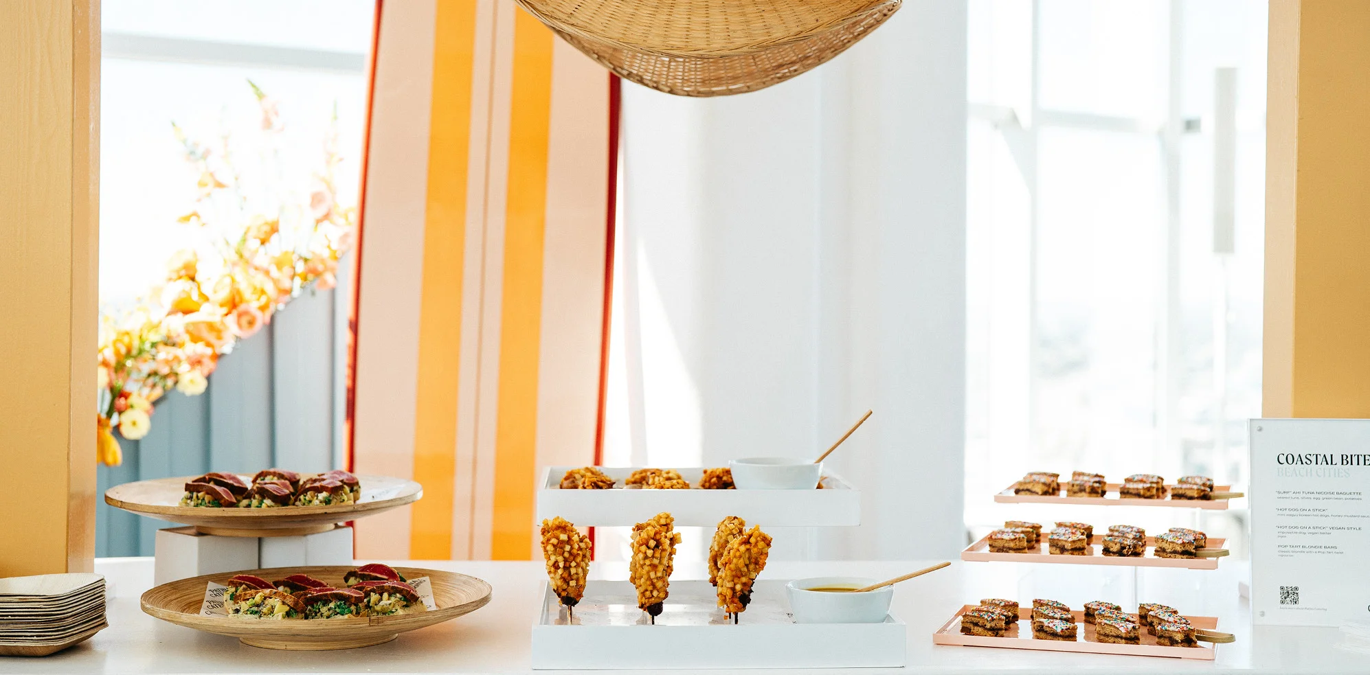 Patina Catering crafted a series of themed food stations spotlighting bold, inventive dishes inspired by distinct Los Angeles regions — including dishes like Yucatán Ceviche, Cochinita Pibil, Ahi Tuna Niçoise Baguettes, and Vegan Dan Dan Noodles. A custom mocktail bar featured signature drinks to complement the experience.